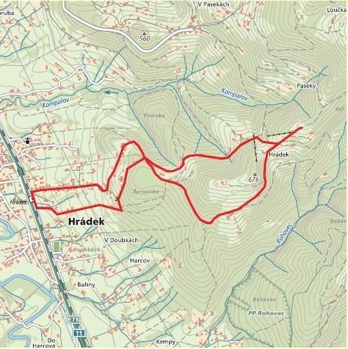 Vyrážíme od rozcestí u železniční stanice směr Filipka a hned ze startu ostře stoupáme po silničce nad obec. Při pohledech zpět máme pěkné výhledy na protější hřeben Moravskoslezských Beskyd (Vel. Kyčera - Ostrý - Javorový). Stezka Vás za stálého stoupání přivede na rozcestí, kde se nachází přírodní hřiště i s posezení, kde je možné si odpočinout a piknikovat. Od hřiště se vydáte asfaltovanou silnicí směrem k chatě Hrádek. Silnice záhy vede bukovým a později smrkovým lesem ve zvlněném terénu. Po opuštění lesního stínu budete prudčeji stoupat a míjet několik domků u cesty. Silnice přestává stoupat a po několika desítkách metrů narazíte na turistickou chatu Hrádek.