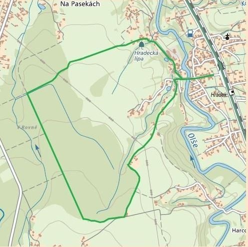 Trasa dále pokračuje po místní komunikaci směrem k Bystřici a po dalších 200 metrech odbočuje do prudkého kopce mezi domy. Na kopci je nenápadná odbočka z trasy mezi ploty, k ohromné, majestátní lípě, která pamatuje zrození Hrádku. Její věk je totiž odhadován na víc jak 600 let.