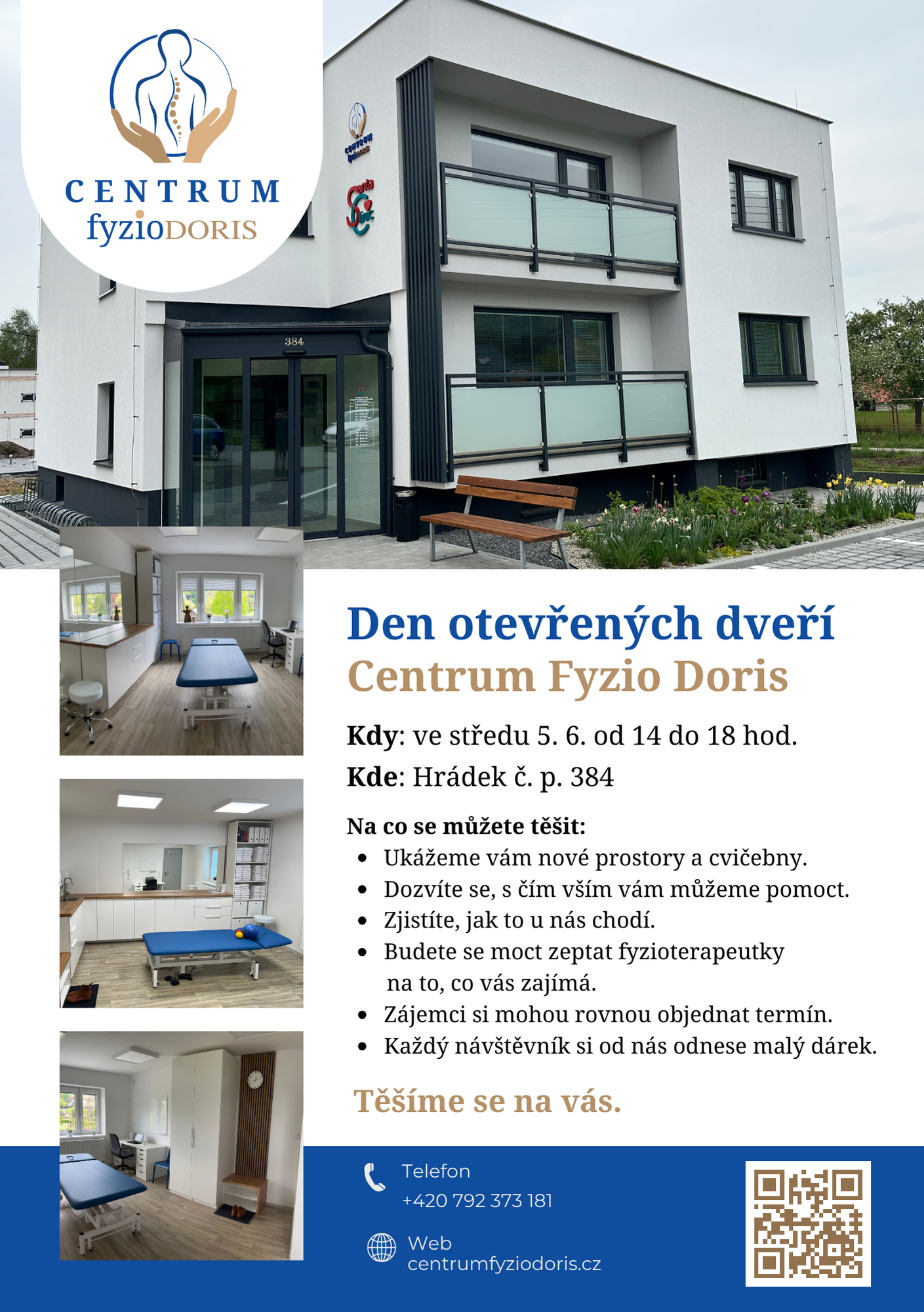 Kde? V Hrádku č. p. 384, v patře nad ordinací praktické lékařky. Zjistíte, jak to tam chodí a s čím vším vám mohou pomoci. Prohlédnete si nové prostory a budete se moct zeptat fyzioterapeutky na své potíže. Kdo bude chtít, může si rovnou objednat termín. Každý návštěvník si kromě zážitku odnese i malý dárek. TĚŠÍ SE NA VÁS za tým Centra Fyzio Doris - Mgr. Dorota Harvanová (Fyzio Doris